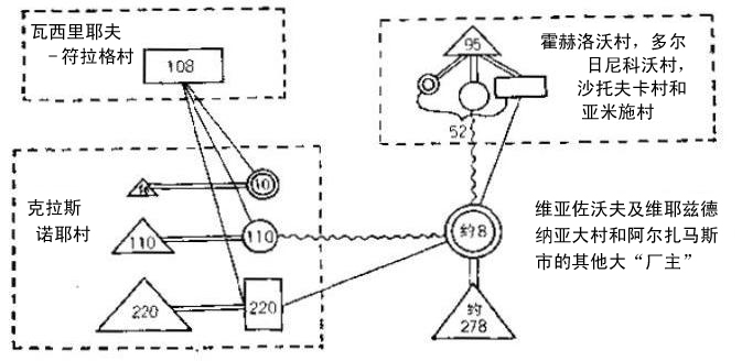 如果按官方工厂统计判断,制毡业中“资本主义”的发展是很薄弱的:整个欧俄总共只有55家工厂,1212个工人,生产总额为454000卢布(1890年《工厂一览表后》)。但是,这些数字只表明了从广泛发展的资本主义工业中偶然抽出的一个片断。下诺夫哥罗德省在“工厂”制毡业的发展方面居于首位,而该省这一工业的主要中心,是阿尔扎马斯城和城郊的维耶兹德纳亚镇(在这两个地方有8家“工厂”,278个工人,生产总额为120000卢布;1897年居民为3221人,而在克拉斯诺耶村居民为2835人)。恰好在这些中心地区附近,“手工”制毡业很发达,约有243个作坊,935个工人,生产总额为103847卢布(《俄国手工工业调查委员会的报告》第5编)。为了明显地表明这一地区制毡业的经济组织,我们试用图解的方法,以特别的符号来表示在该行业的总结构中占特殊地位的各种生产者。