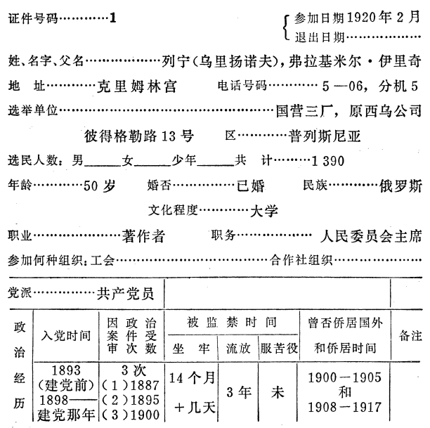 173 这张表是在1920年2月16日和19日之间填写的。登记表前半部是用打字机打出的,政治经历栏是列宁填写的。——374。