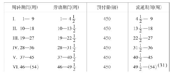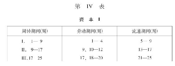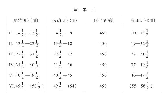 第一个周转期间12周。第一个劳动期间9周,其中预付资本的周转,在第13周开始时完成。最后3周有追加资本300镑执行职能,并且开始第二个9周的劳动期间。