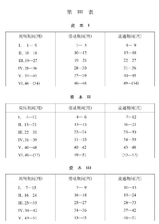 这里的情形和第I节所讲的情形十分相似,区别只在于现在不是两个资本而是三个资本互相交替。各个资本并不互相交叉或交错;每一个资本都可以分别予以考察,直到年终。如同第I节所讲的那样,在一个劳动期间结束时同样没有资本游离。资本I在第3周末全部预付出去;在第9周末全部流回,而在第10周开始时重新执行职能。资本II和资本III也是这样。有规则的、完全的交替排除着任何资本游离。