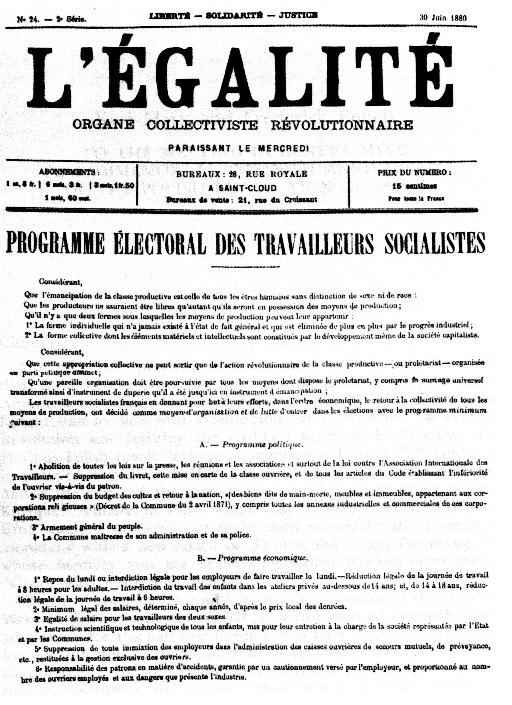 The French socialist workers, in adopting as the aim of their efforts the political and economic expropriation of the capitalist class and the return to community of all the means of production, have decided, as a means of organization and struggle, to enter the elections with the following immediate demands: